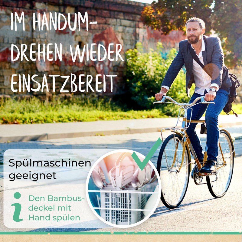 - 100% leak-proof – thanks to the food-safe full jacket seal, the FSC-certified bamboo lid effectively and permanently prevents leakage of your drinks even in demanding everyday situations