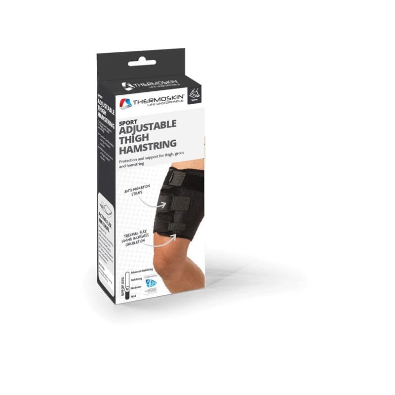 Thermoskin Sport Thigh Hamstring Adjustable, provides protection for thigh, groin and hamstring during periods of increased activity. Trifold straps allow greater adjustability and wearer compliance. Featuring an adjustable anti-migration strap. Promotion of increased blood flow may help minimise occurrence of new or existing injures.