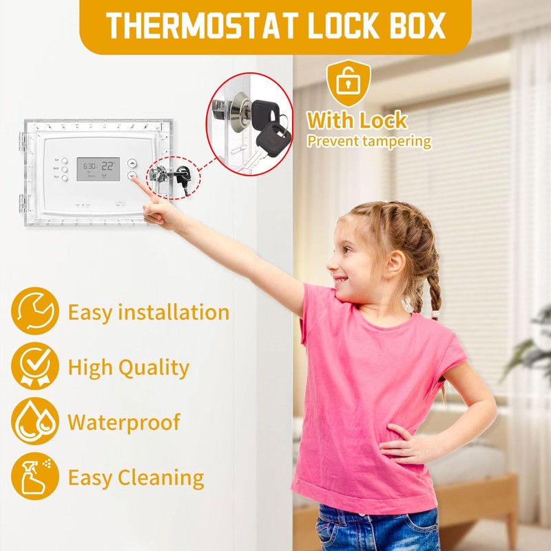 1. THERMOSTAT PROTECTION WITH KEY Our thermostat lock box features a combination lock to prevent tampering, damage and unauthorized changes to thermostat settings. Protect your controls from unwanted fingers and protect your thermostat from costly kickbacks.