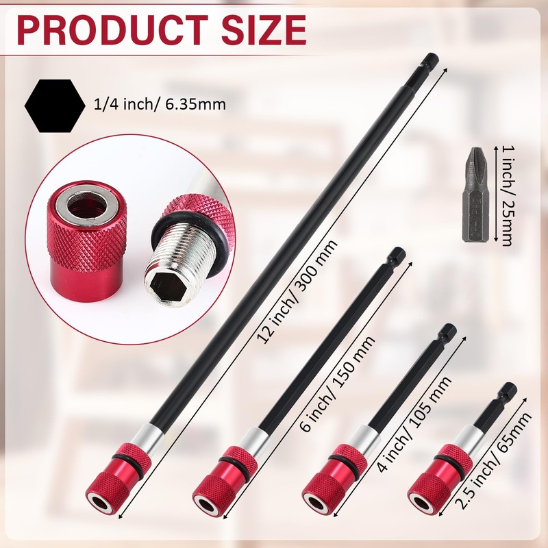 - Vast Assortment for Different Use: this drill extension bit holder set includes 8 pieces of bit driver extension holders and 8 bits; It features 4 different sizes (12 inch/ 300 mm, 2.5 inch/ 65 mm, 4 inch/ 100 mm and 6 inch/ 150 mm) with 2 pieces for each size offering a broad selection for various tasks; No matter what your daily use or replacement needs are, our set has got you covered