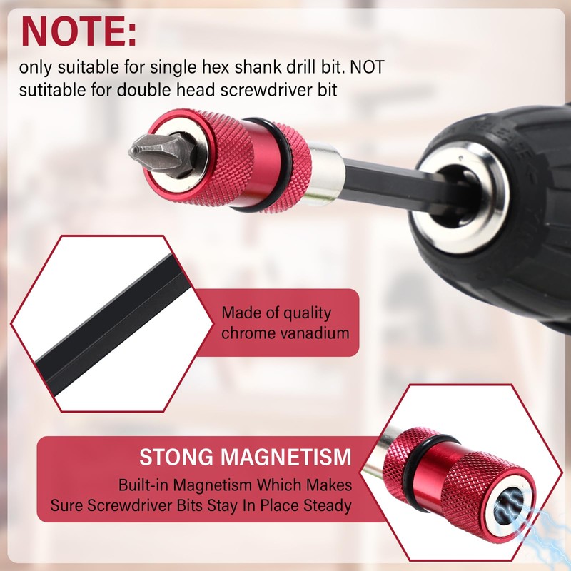 - Practical Magnetic Design: the bottom hole part of the hex bit extension is magnetized, ensuring that the screwdriver bits stay steady and firmly fixed on screws; This prevents the bits from falling off, making your work more efficient and easy; However, the hex shank doesn't exhibit magnetism