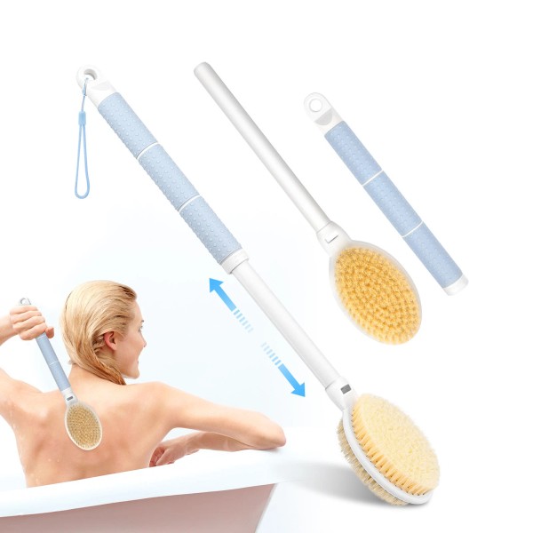 Product Description Telescopic long-handle shower brush with dual-sided bristles for gentle exfoliation and deep massage. Extendable non-slip handle allows easy back scrubbing. Made of eco-friendly materials for daily skin care and improved circulation.Product Feature