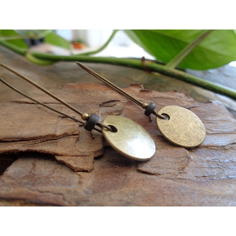 These handmade earrings are made of thick discs made of bronze coloured metal on long XXL Kidney hooks. The hooks have still been finished with a handmade black ceramic bead and a small metal bead. Minimalist and unique... The earrings come in an organza bag and are therefore also suitable as a gift. Length: 4.8 cm, disc: 1.5 cm, hook: 3.5 cm