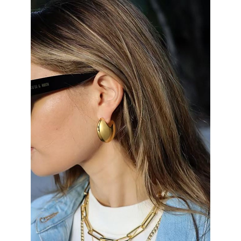 Thick Gold Chunky Hoops Earrings for Women,18K Real Gold Plated Lightweight Hoop Hollow Earrings Non-Tarnish, Brass, No Gemstone