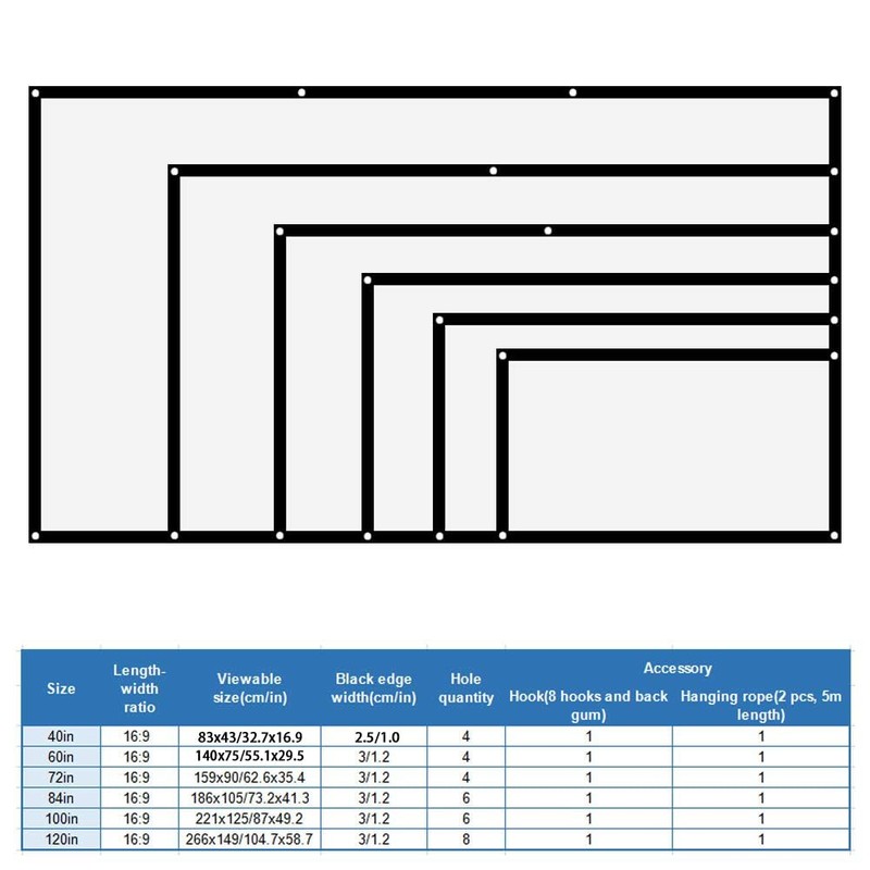 Optional Size: 40in, 60in, 72in, 84in, 100in, 120inSizeLength-width ratioViewable size(cm/in)Black edge width(cm/in)Hole quantityAccessoryHook(8 hooks and back gum)Hanging rope(2 pcs, 5m length)40in16:983x43/32.7x16.92.5/1.041160in16:9140x75/55.1x29.53/1.241172in16:9159x90/62.6x35.43/1.241184in16:9186x105/73.2x41.33/1.2611100in16:9221x125/87x49.23/1.2611120in16:9266x149/104.7x58.73/1.2811
