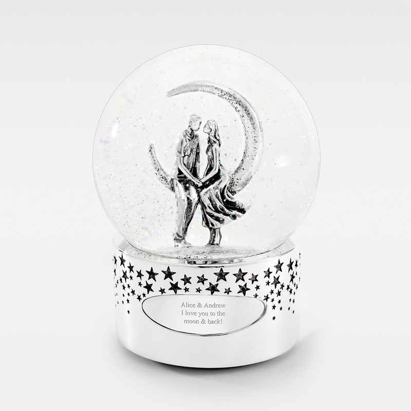 • KEY DETAILS – Silver moonlight couple snow globe with stars stamped around the base. Features a couple sitting on a crescent moon inside the globe. Clean with a soft cloth.