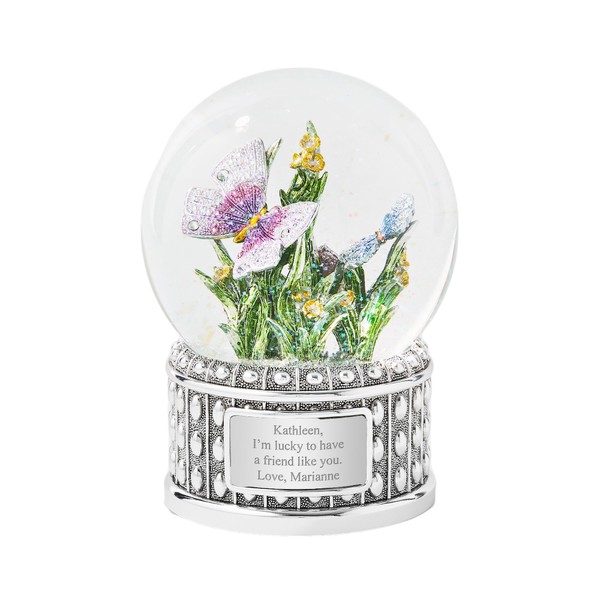 - SUPERIOR QUALITY AND DESIGN – This personalized snow globe is a miniature garden that’s always beautiful, never needs tending, and comes complete with two lovely jeweled butterflies. The entire piece, including the riveted base, is 6.8 inches tall.