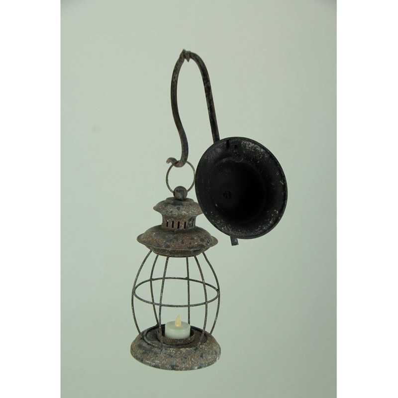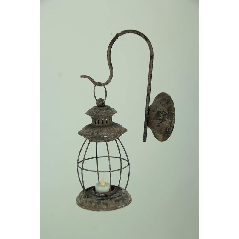 A vintage lantern style with an antique look, this metal wall sconce brings a warm glow to any decorating style. The curvy globe lantern and old style design softens the look of the metal construction and the aged finish gives it a lovely weathered patina. Use with your favorite tealight or votive, not included, or use a battery operated candle for worry-free lighting. This 16.25 inch high, 9.5 inch long, 5 inch wide candle sconce brings a simply stunning look in a timeless design. Easy to hang with a pre-installed keyhole hanger on the back.