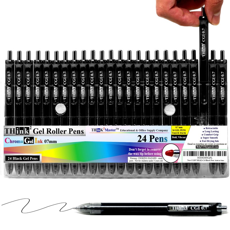 [24 Pens - Black Ink] Think2 0.7mm CGI Retractable Gel Pens. (24 Black) Medium Point Rollerball Pens with Smooth Quick Drying Ink.