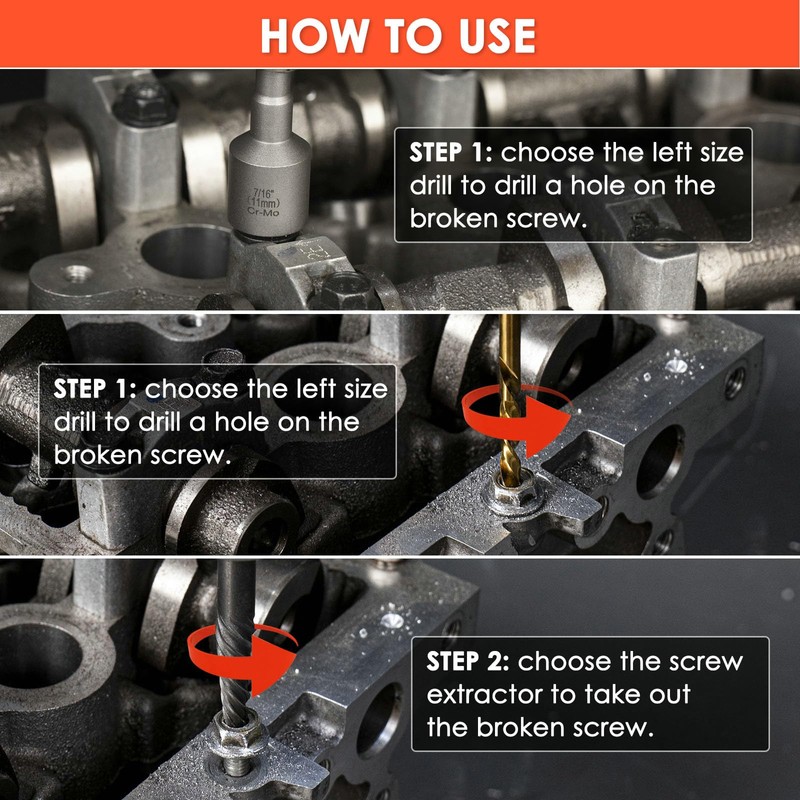 - Easy Out: The 135° split point tip of the reverse drill bits reduces cutting resistance for sharp and quick cutting. Spiral screw extractor grips the screw tightly and easily spins it out.