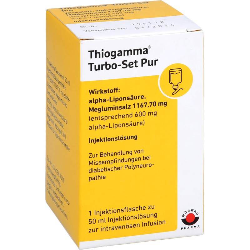 Thiogamma Turbo-Set. Anwendungsgebiet: Thiogamma Turbo-Set wird angewendet bei Missempfindungen bei diabetischer Nervenschädigung (Polyneuropathie).