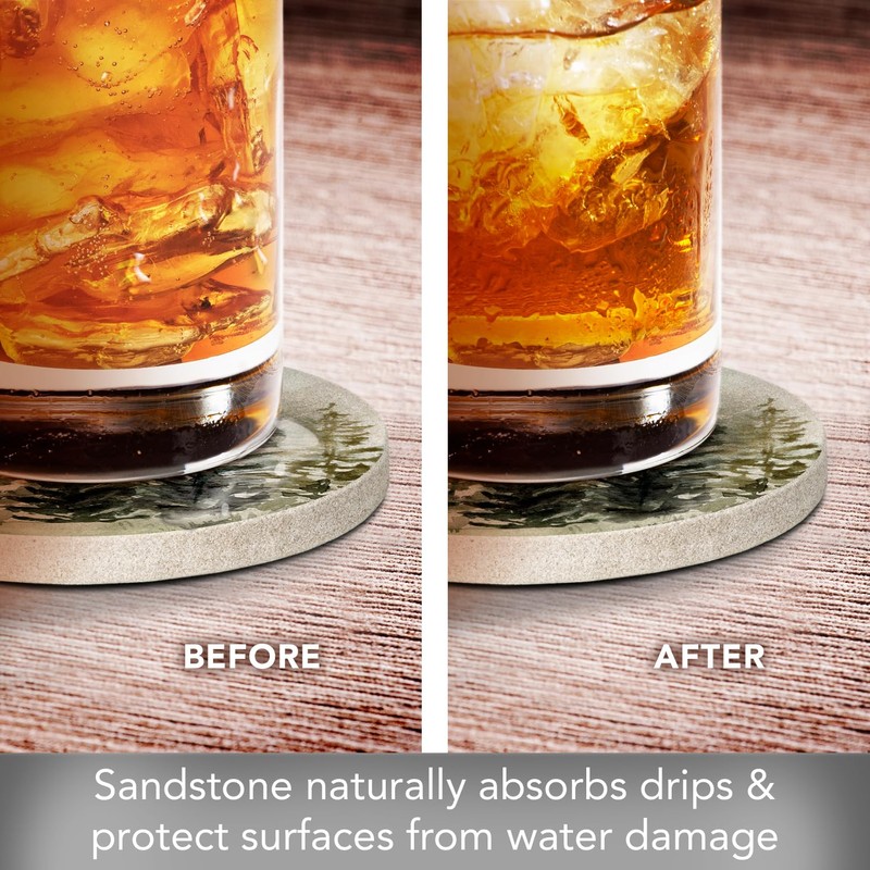 Thirstystone Misty Treeline 4 Pack Round Natural Sandstone Coasters with Protective Cork Backing Manufactured in The USA