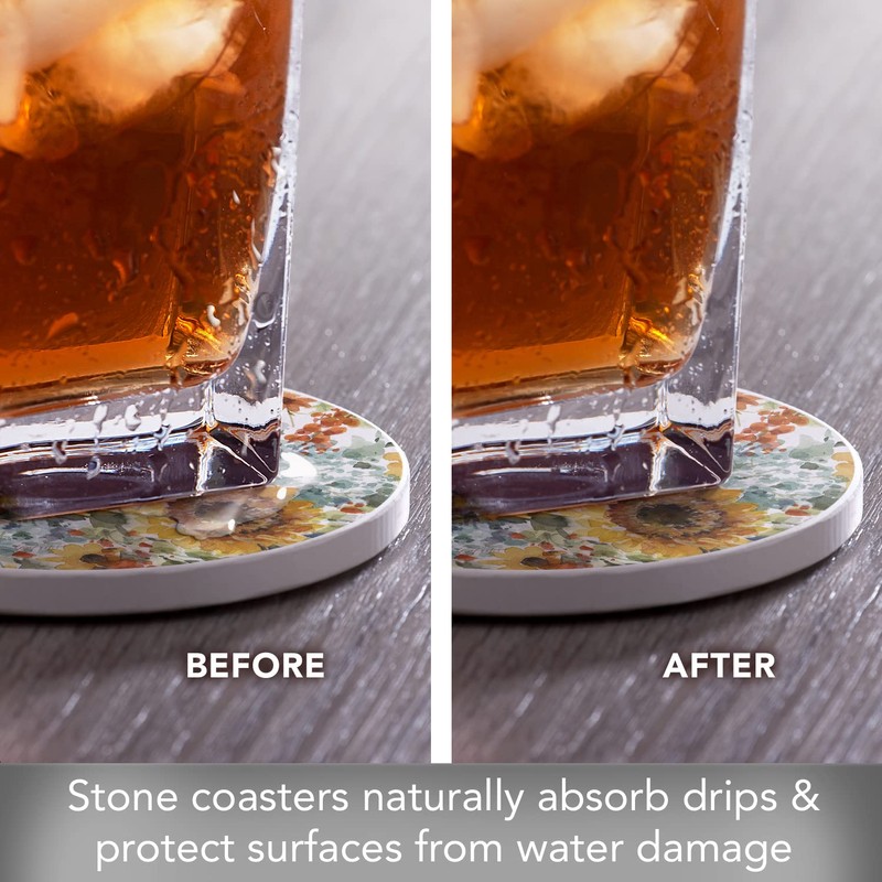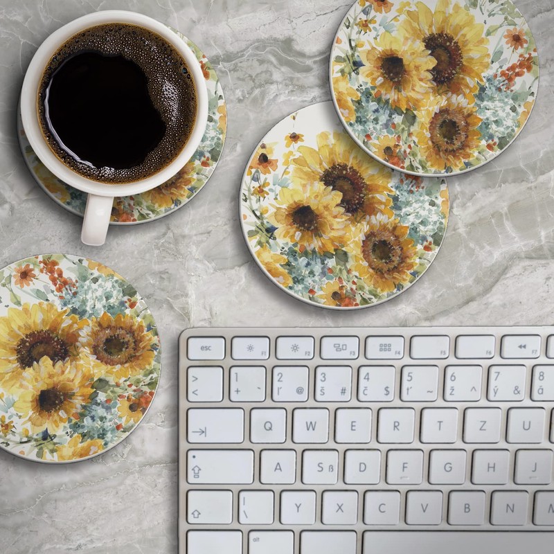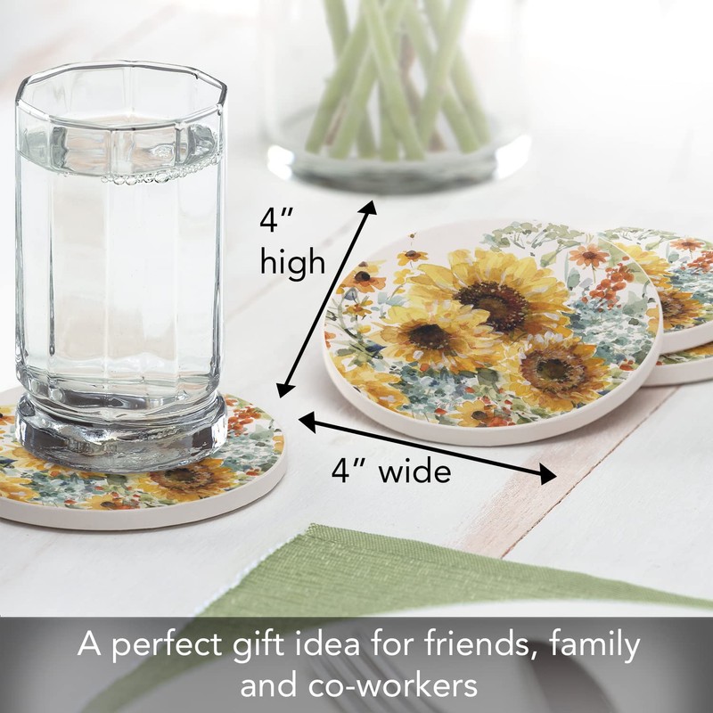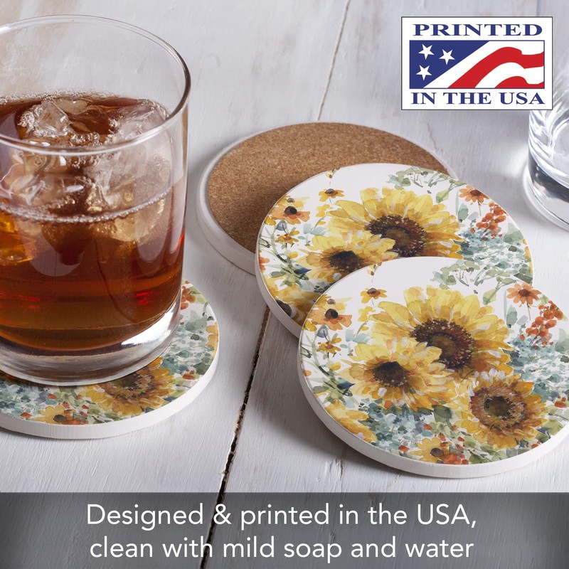 Thirstystone Sunflowers Forever 4 Pack Round Absorbent Stone Coasters with Protective Cork Backing Manufactured in The USA Artistic Absorbent Easily Wipes Clean
