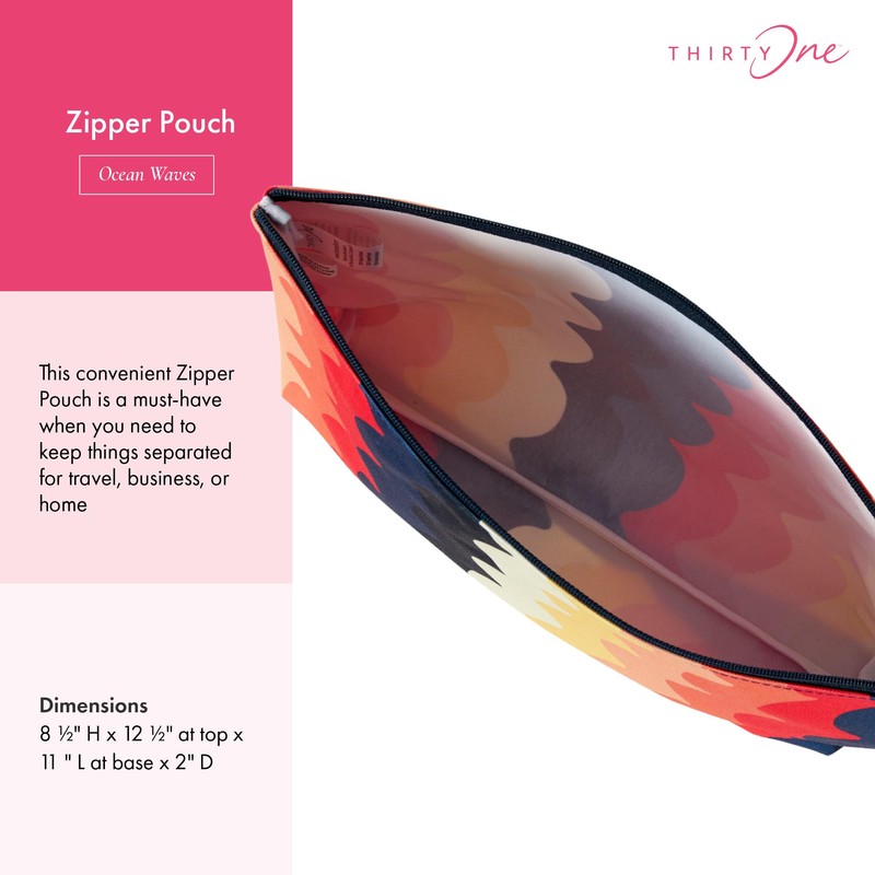 - ESSENTIALS POUCH: Simplify life with the Thirty-One Gifts Zipper Pouch. This zippered bag with a laminated interior makes an ideal storage pouch for keeping small items organized in other bags. Dimensions: 8 1/2" H x 12 1/4" L (at top) x 11" L (at base) x 2" D.
