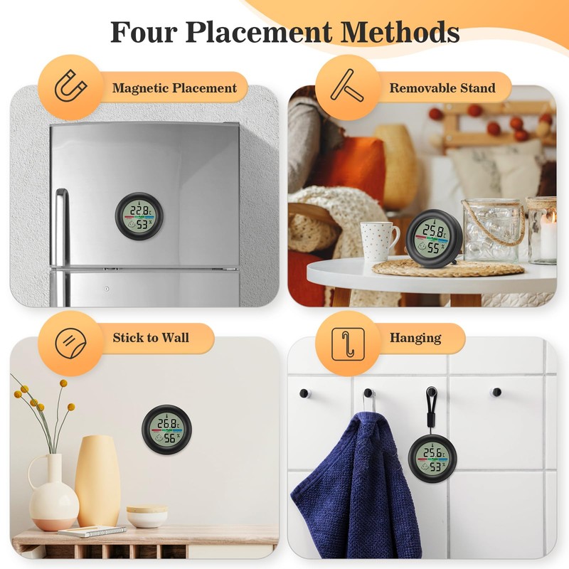 - Easy to Install The humidity thermometer has four installation options: table stand, magnetic back, glue, hanging rope. Widely used in rooms, greenhouses, wardrobes, wine cellars, warehouses, grain stores.