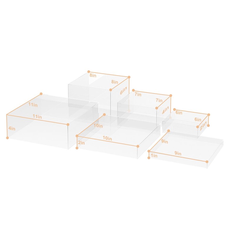 ltiple Sizes:The acrylic display risers have 6 different sizes, from low to high heights, which can be easily stacked together without taking up too much space. When you need to use it, you can take out the display risers to display your itemse