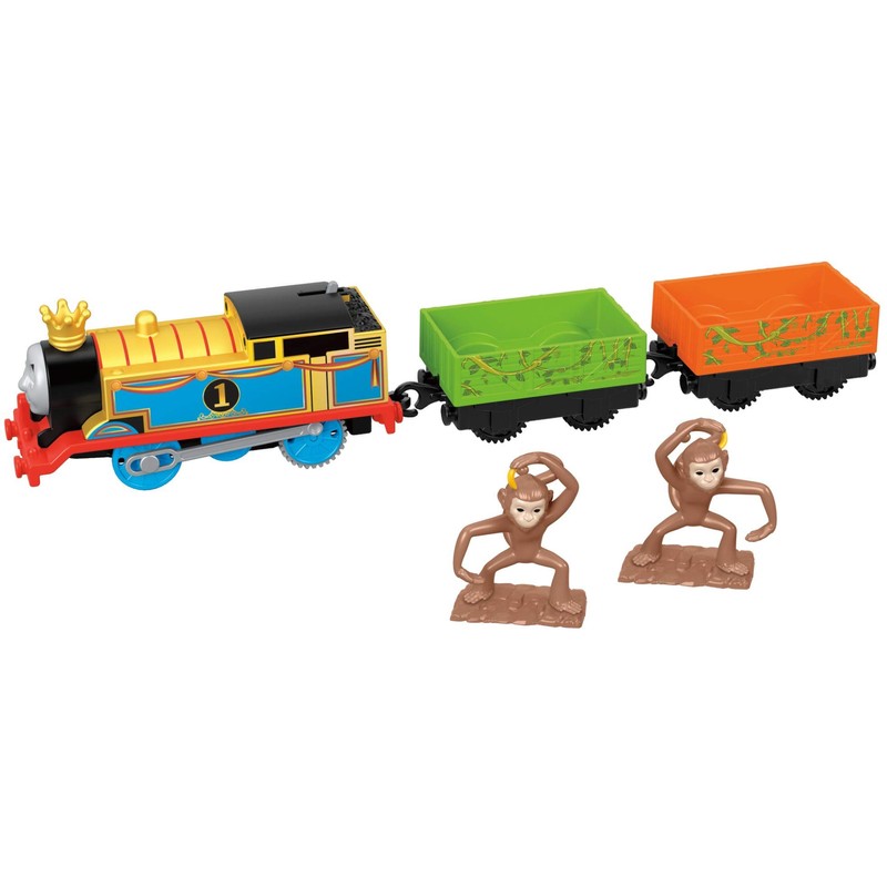 - Battery-powered TrackMaster Thomas motorized toy train comes with two cargo cars and two monkey figures