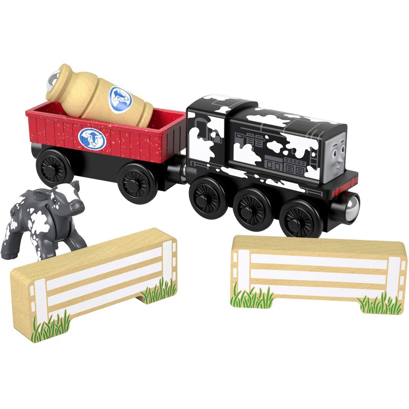 What kind of stories will children create when they discover the world of Thomas & Friends Wood toys? The possibilities are as limitless as their imaginations. Thomas & Friends Wood toy trains deliver exceptional quality, imaginative play, and an emotional connection that only these iconic characters can provide. For even more fun ways to play, Diesel's Dairy Drop- Off comes with milk-splattered Diesel, a poseable cow figure, a cargo car, a milk jug cargo piece, and two accessories, so children can use their imaginations to create endless stories. For a seamless playtime experience, the redesigned Thomas & Friends Wood trains and vehicles are also compatible with classic Thomas & Friends Wooden Railway track (sold separately and subject to availability).