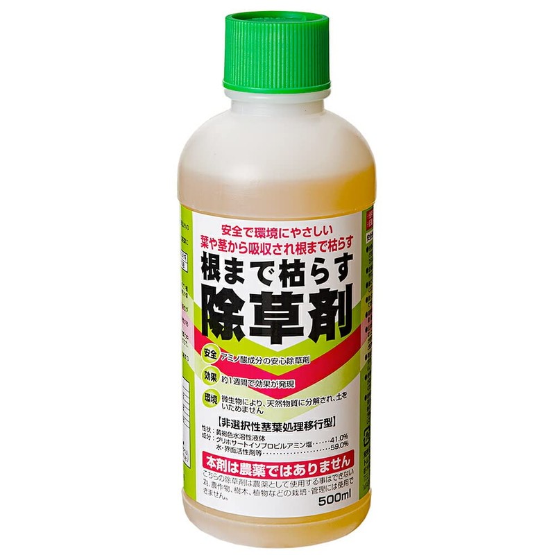 This herbicide is a glyphosate solution that absorbs from leaves and does not disturb soil. It is absorbed from the stems and wither down to the roots. Absorbs from the stems of the weeds and wither to the roots, so it has excellent weeding effect! Microorganisms break down into natural substances and remain in soil and will not trap soil. Tomson Weed To The Root Herbicide 16.9 fl oz (500 ml), Suitable for Roads, Parks, Playgrounds, Homes, Parking Lots, Glue Surfaces, etc. Features: Suitable for first grade and perennial weeds. The liquid that fell to the ground is decomposed by microorganisms in the ground, and will not cause soil. It is sprayed on the weeds and absorbed from the stems, so it will dry firmly to the roots. ● Effects appear approximately 1 week later. Ingredients: Isopropyl ammonium = N-(hoshomomethyl) glycinate: 41.0%, water, surfactant, etc.: 59.0% Characteristics: Yellow water soluble liquid; Contents: 16.9 fl oz (500 mL) / 500 sq. m, 150 tsubo) Country of Origin: China; How to use: Spread the stem with a sprayer, etc. Because the chemical liquid on the soil quickly reactivates in the soil, it is not absorbed from plant roots, so it is not effective when sprayed before weeds develop. If rain falls within 6 hours after spraying, the effect may be inferior. Scatter formula: For first grade weeds: diluted to 100 to 200 times. For perennial weeds: dilute to 50 times. For vine perennial weeds: diluted to 25 to 50 times. For cedar and seitaka dilute: 15 to 25 times. Diluted with scatter Liquid Volume: 1.6 - 3.8 fl oz (50 - 100 ml) (Dilution Liquid Content Per 10 Earrs) 1.6 - 3.8 gal (50 - 100 L). *Please be sure to spread this product on leaves and stems. In conditions where the cedar has been past the growth period of cedar and is impregnated in other weeds, the effect may be inferior.