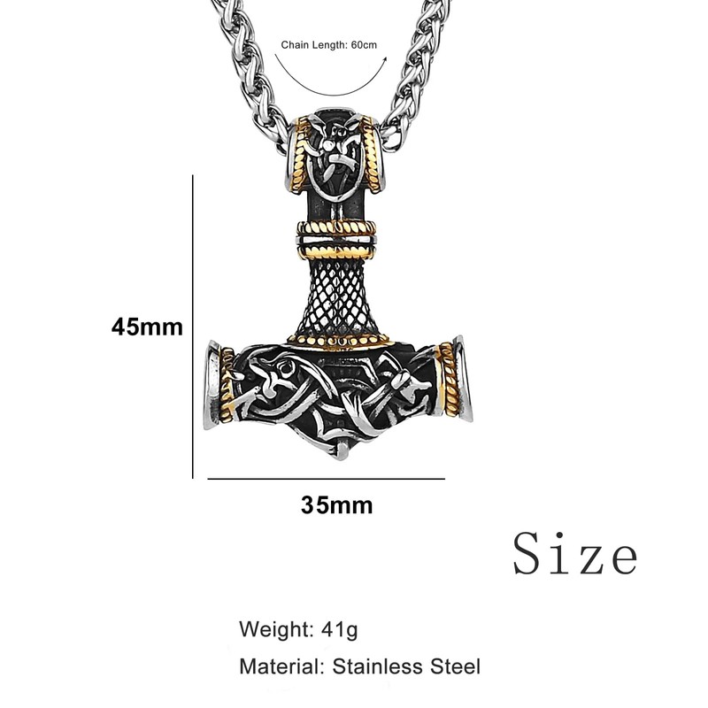 - Dimensions: Thor's hammer pendant size: 4.3 cm (1.69 inches) x 3.12 cm (1.23 inches); and weighs 30 g. Chain width 0.2 inches, length 23.6 inches, adjustable.