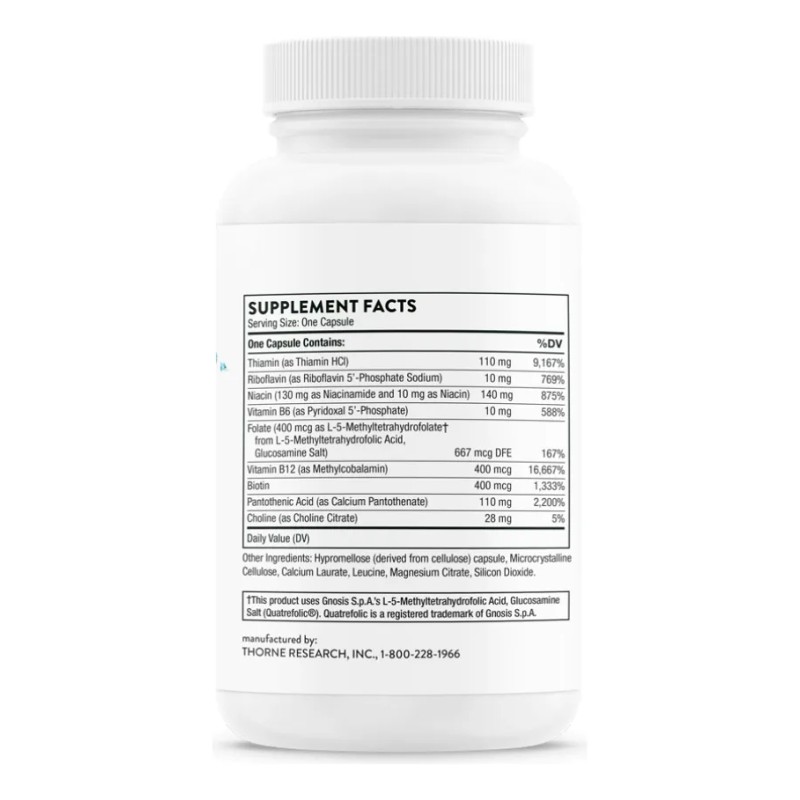 Detalles básicos del complejo B La fórmula del complejo básico B de Thorne contiene las formas activas de las vitaminas B, lo que facilita su absorción por el organismo. Esta combinación integral proporciona múltiples beneficios para apoyar su estilo de vida, como ayudar a convertir los alimentos en combustible y mejorar la energía celular. * Debido a que la mayoría de las vitaminas B no permanecen en el organismo, deben adquirirse a través de la dieta y los suplementos para ayudar a mantener una salud óptima.