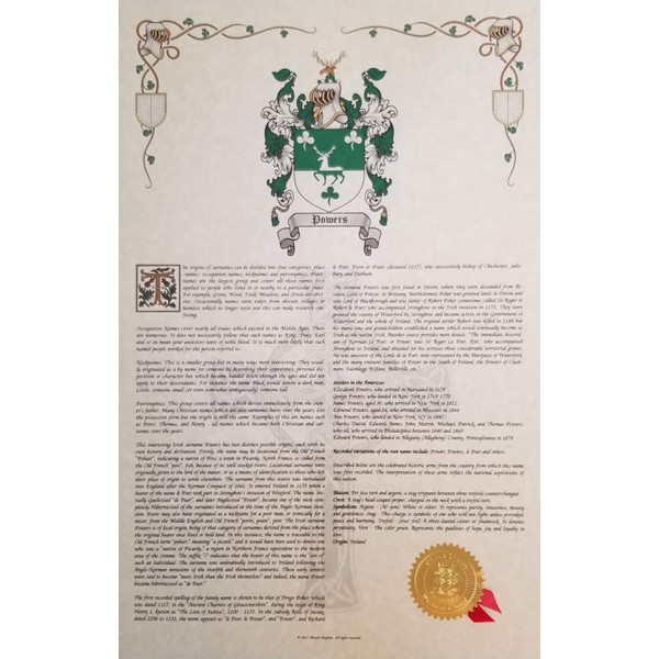 The images used are EXAMPLES of what the product(s) will look like. This COLLECTIBLE product is a 11x17 print. The Surname for this product is the first word(s) in the products title and the country of origin is indicated with the last three words in the product title. This print uses the earliest coat of arms associated with a bearer of the surname (last name) and the time tested surname etymology, a history of the name and its origins throughout the ages. If available, it includes the ancient origin of the name, spelling variations, early movement of the surname during the Middle Ages, noteworthy bearers from around 1400AD or earlier up to current day, and first settlers in North America. There may be different variations of Coat of Arms for each surname and the one we use is the oldest registered Coat of Arms verified in history.
