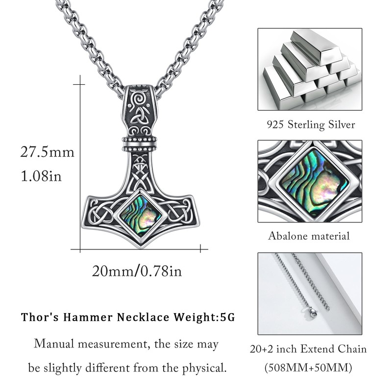 - 【Thor Hammer Necklace Material】Men thor's hammer necklace is made of 100% 925 sterling silver and decorated with abalone shell, which is nickel-free, lead-free and cadmium-free, hypoallergenic. It is safe for your skin!