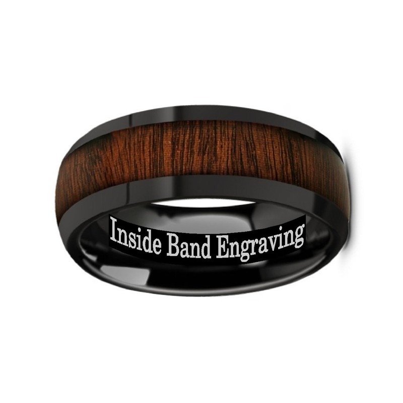 ROSAE Black Ceramic Domed Profile Polished Finish Mens Wedding Band with Genuine Fine Grain Deep Rose Wood Inlay - 8mm. Free custom engraving on the inside of the band. Can be worn as a Wedding Ring or Promise Ring, for men or women. Free Lifetime Sizing and Lifetime Warranty on all Thorsten Ceramic/Wood Inlay rings.