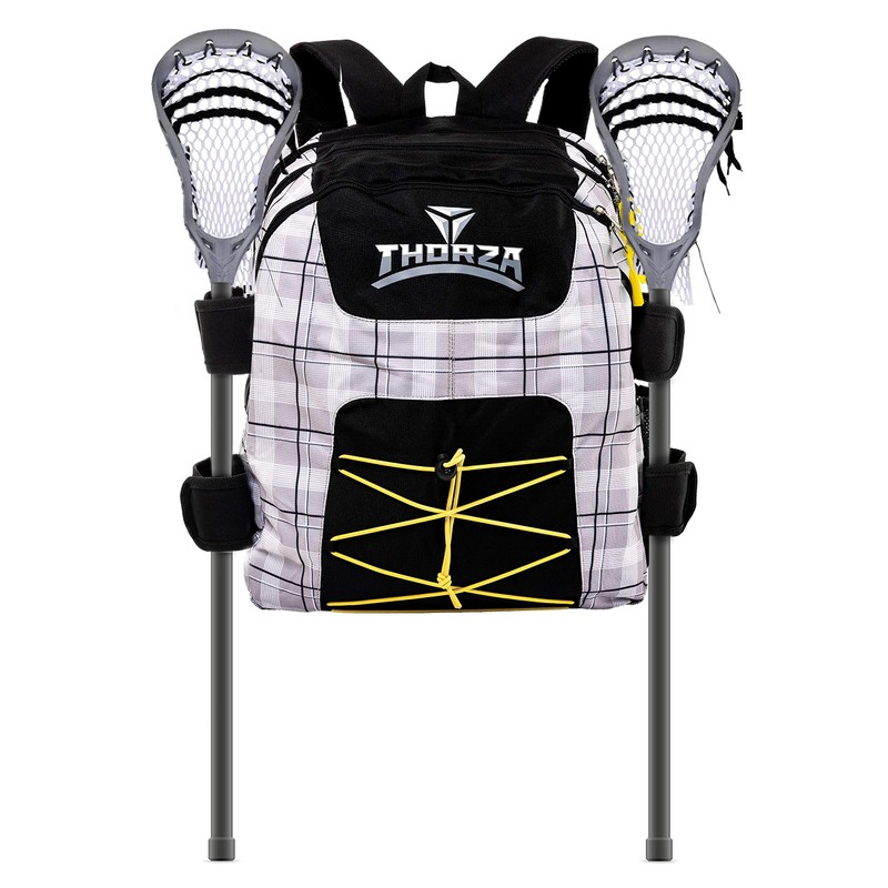 * Thorza Lacrosse Backpack * Supports 2 Lacrosse Sticks * 3 Large Zippered Compartments * 2 Small Hidden Zippered Pockets * Stores Sports Gear and Personal Items * Heavy-Duty 600D Polyester Material * Convenient Carry Handle * Adjustable Shoulder and Chest Straps * Gender Neutral Plaid Color * Ideal for Multiple Sports (Male and Female)