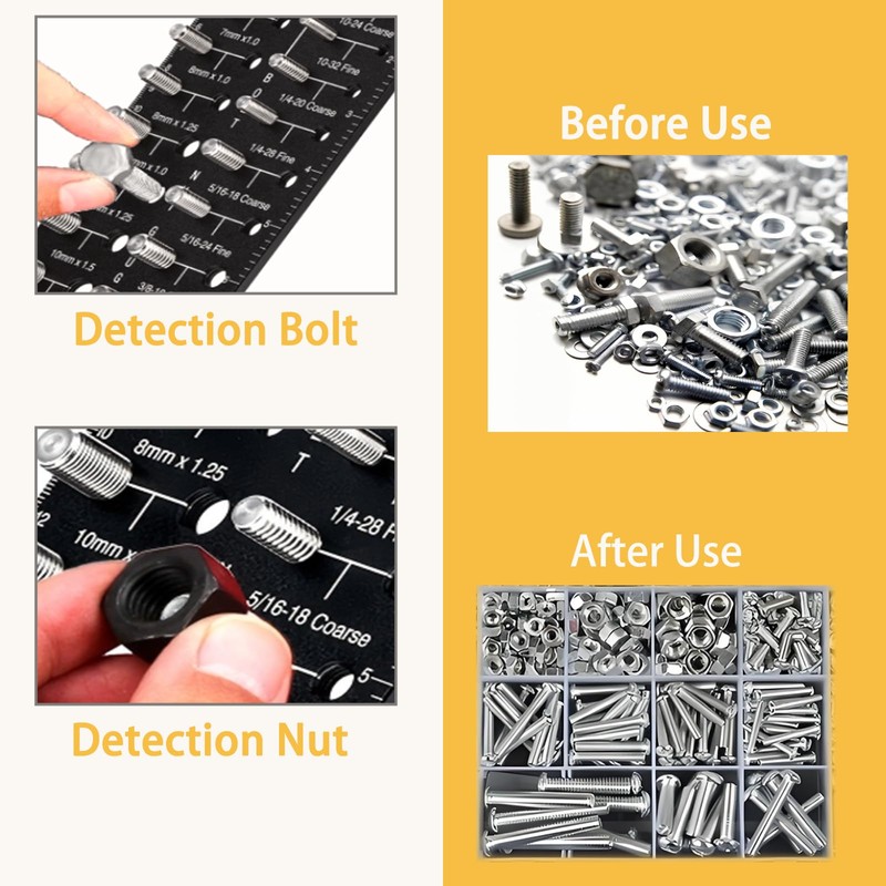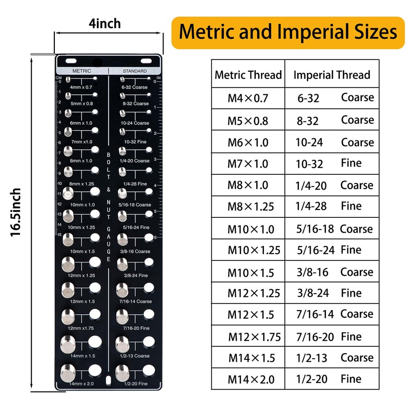 - [Versatile and practical] The bolt and nut detector can not only measure and determine the size of bolts and nuts, but also has metric and imperial rulers on both sides of the product to facilitate measuring the length of bolts or nuts. The product also has a cantilever placement function, which is convenient for storage in the warehouse.