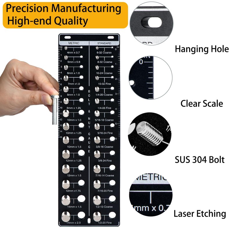 - [Professional and general] All bolts and threads fully comply with Go & No Go Class 2B ANSI measurement standards, and have laser-etched inch and centimeter measurement scales on both sides of the bolts and internal threads for universal use.