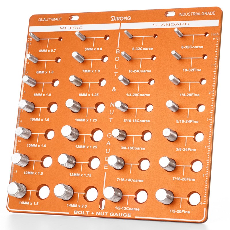 - WIDE-RANGING SIZE DETECTION : Our Nut and Bolt Thread Checker instantly identifies 28 distinct sizes, encompassing Metric thread sizes from M4 x 0.7 to M14 x 2.0, and Imperial threads from #6 - 32 Coarse to 1/2 - 20 Fine. A one-stop-shop for all standard hardware verification.which can help you identify different sizes of nuts and bolts quickly and easily