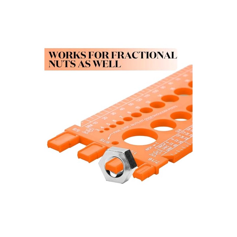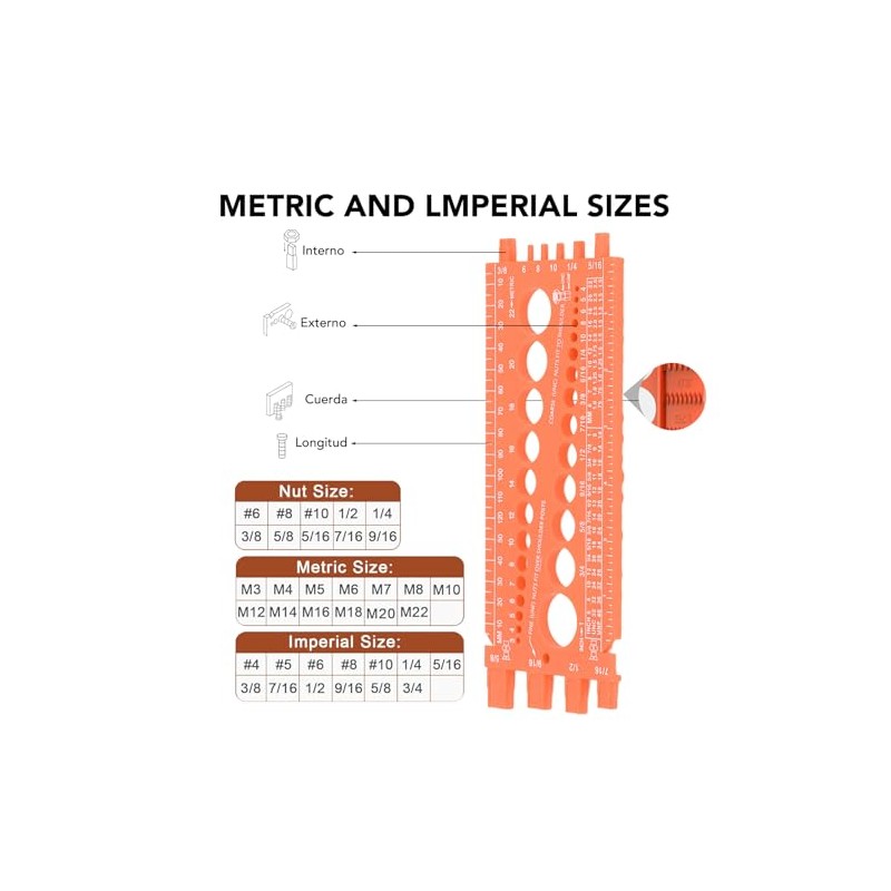- All-in-One Design: Combines bolt measurement holes, imperial/metric nut checkers, and embossed thread profiles for quick pitch identification.