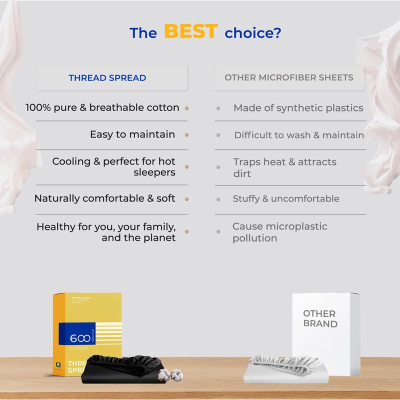 - Why Buy Thread Spread 100% Cotton and Not Microfiber?: Our 600 Thread Count fitted sheets are made from mercerized cotton for increased luster and brighter, deeper colors that don’t fade and pill even after multiple washes. For healthy sleep, opt for our 100% cotton queen fitted sheet that is natural in formulation, cool to the touch, and breathable to create a heavenly sleeping experience. Microfiber is cheap and used mainly for cleaning. It attracts dust quickly and is harmful to your skin