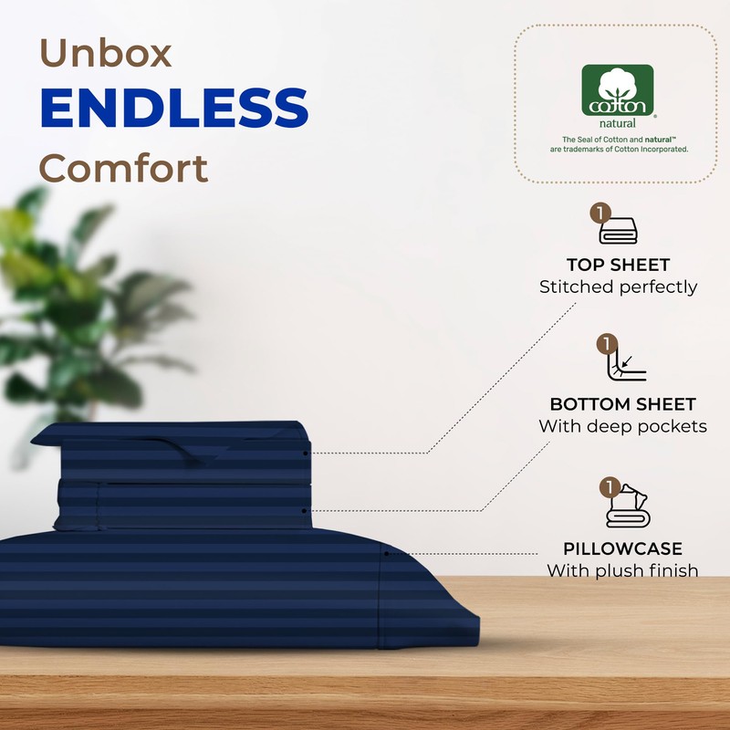 THREAD SPREAD Striped Egyptian Cotton Sheets Twin XL Size - 600 Thread Count 3 PC Damask Twin XL Sheets Deep Pockets, Sateen Weave College Dorm Bedding Twin XL, Fits Mattress Upto 18" - Navy Blue