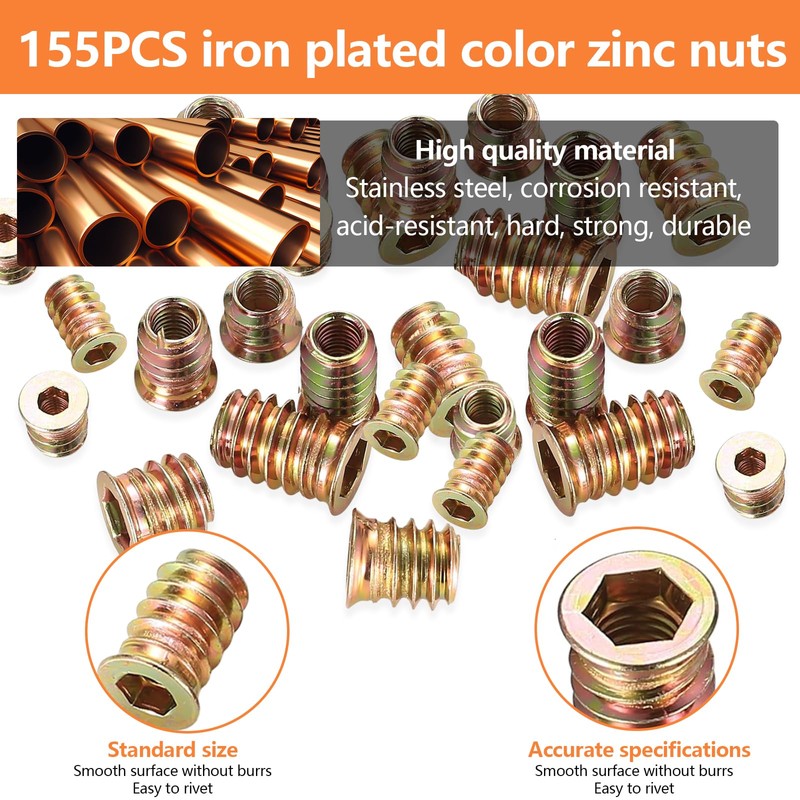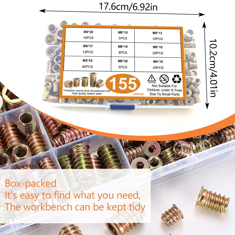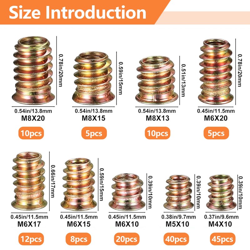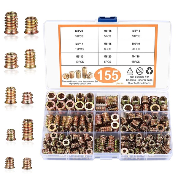 - 【Package included】You will receive 155pcs threaded inserts for wood, including M4 x 10 (45 pcs), M5 x 10 (40 pcs), M6 x 10 (20 pcs), M6 x 15 (8 pcs), M6 x 17 (12 pcs), M6 x 20 (5 pcs), M8 x 13 (15 pcs), M8 x 15 (5 pcs), M8 x 29 (10 pcs), which are enough for your daily use.