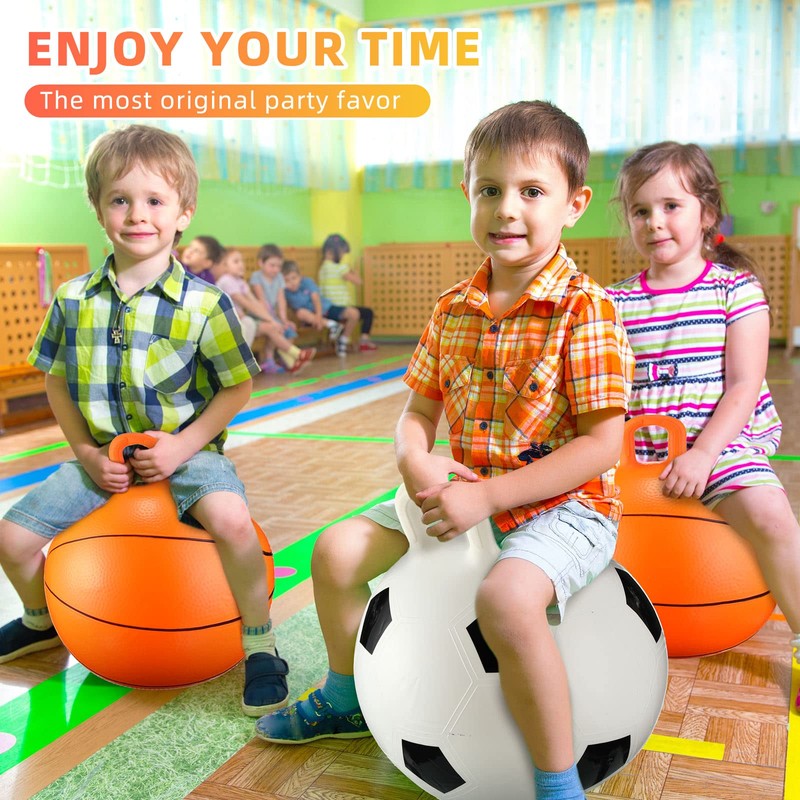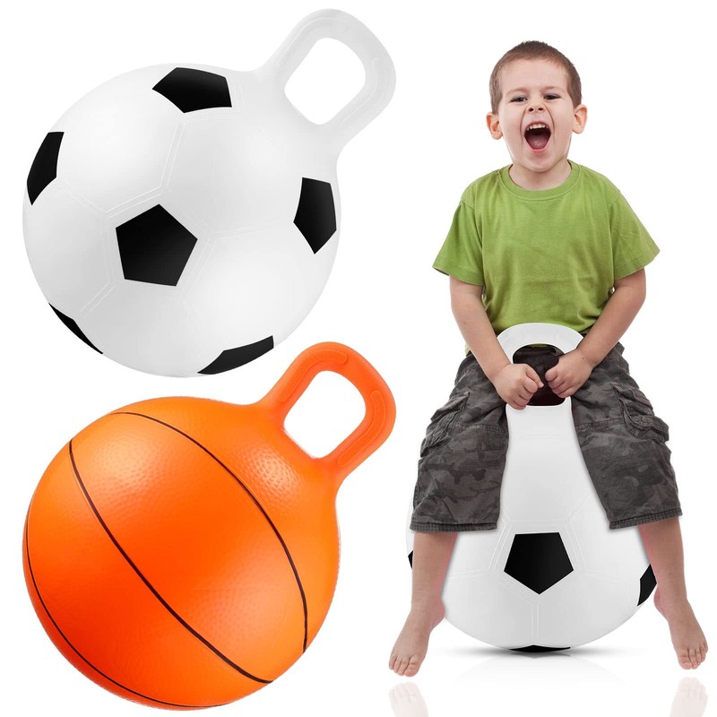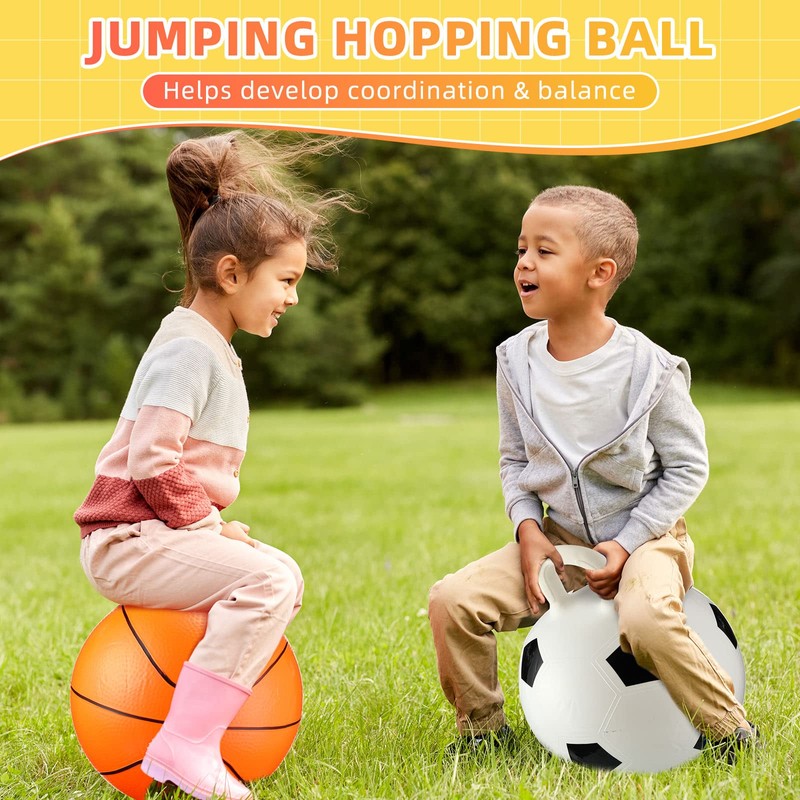 Threan 2 PCS Hopper Ball in Soccer Basketball Style 18'' Jumping Hoppity Ball with Handle Exercise Ball Inflatable Sport Bouncy Balls for Kids 3-6 Years Jumping Sitting Racing