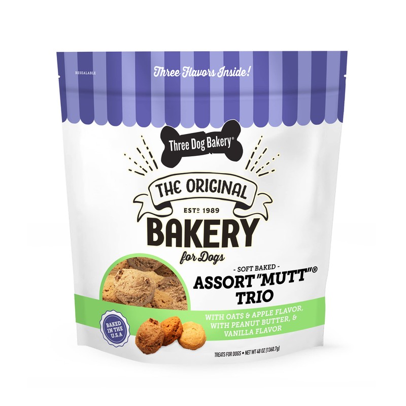 Three Dog Bakery Assort Mutt Cookie Trio, Soft Baked Treats for Dogs, Three Flavor; Oatmeal and Apple, Peanut Butter, and Vanilla, 3 Pound Bulk Resealable Pack