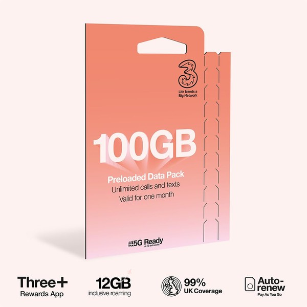 Three Mobile PAYG Voice SIM Pack - 100GB - £15