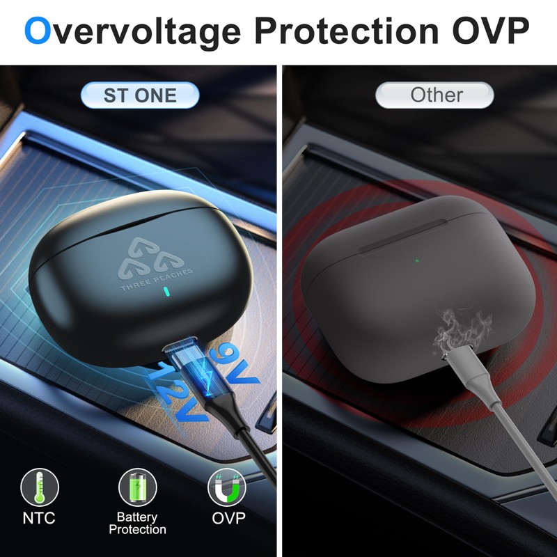 - 【Overvoltage Protection & Charging Temperature Protection】The THREE PEACHE earbuds are equipped with pure cobalt high-performance lithium batteries, the battery life is up to 5 years, and different types of plugs can be used. Charging temperature-controlled battery protection function controls the temperature between 0-45° to protect the headphones from damage during charging.