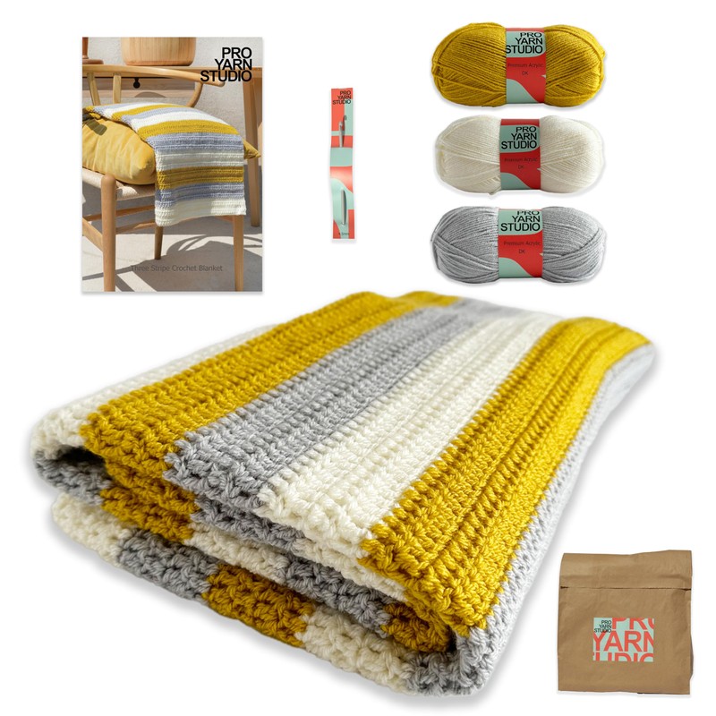Three Stripe Beginners Crochet Kit with 3 x 100g DK Yarn, 4.5mm Crochet Hook, Easy Crochet Pattern, Learn to Crochet Kit