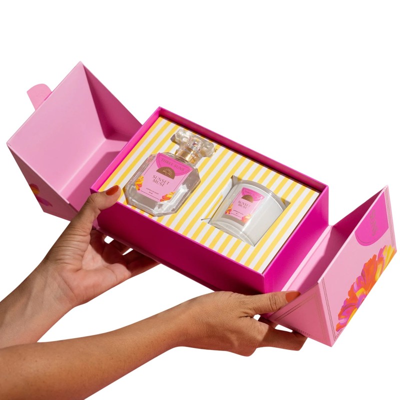The Three Suns Sunset Muse Pack is a delightful combination of fragrance and ambiance to elevate your senses. This exquisite pack includes the Sunset Muse Perfume and the Sunset Muse Candle, both designed to transport you to a serene sunset setting. The perfume offers a captivating scent that lingers throughout the day, while the candle creates a warm and inviting atmosphere in any space. Perfect for personal use or as a thoughtful gift, the Sunset Muse Pack embodies elegance and tranquility. What is included in Three Suns Sunset Muse Pack? • Sunset Muse Perfume 50ml • Sunset Muse Candle 60g What are the features and benefits of Three Suns Sunset Muse Pack? Sunset Muse Perfume: This 50ml perfume captures the essence of a sunset with its unique blend of floral and woody notes, providing a long-lasting and enchanting fragrance that is perfect for any occasion. Sunset Muse Candle: The 60g candle is crafted to create a soothing ambiance with its gentle glow and calming scent, making it an ideal addition to any room for relaxation and unwinding. Who is Three Suns Sunset Muse Pack for? The Three Suns Sunset Muse Pack is for anyone seeking a luxurious sensory experience that combines the allure of fragrance with the comfort of a warm, inviting atmosphere.