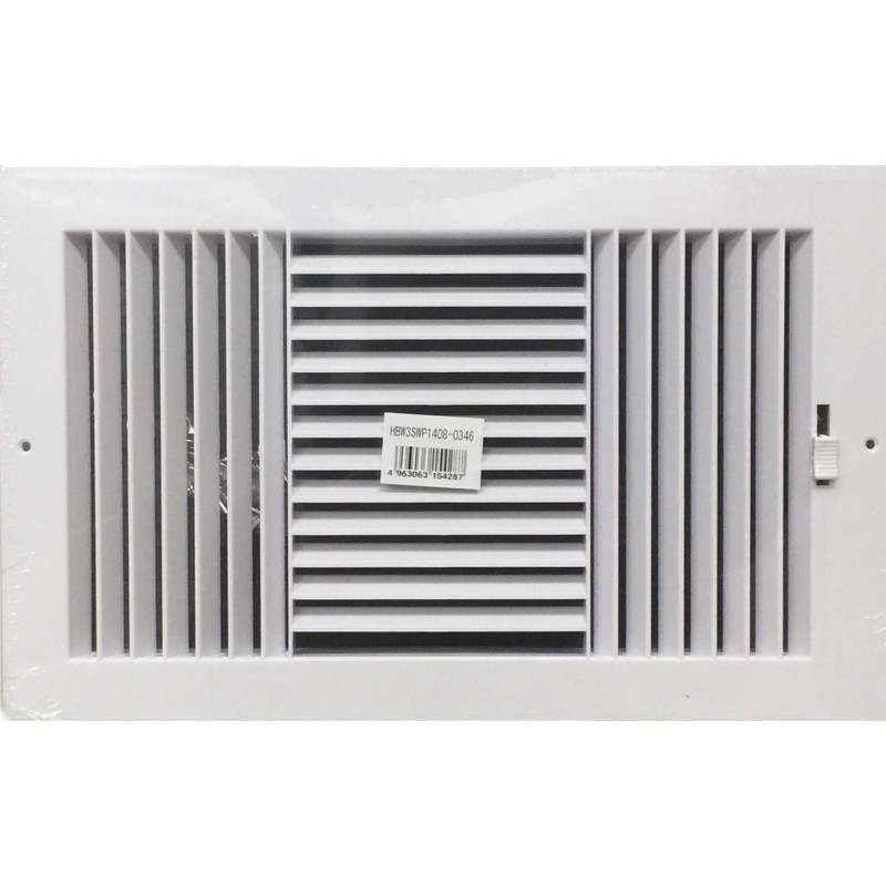 Three-way plastic side wall/ceiling register in white 14"w X 8"h for duct opening (outside dimension is 15.75"w X 10"h)
