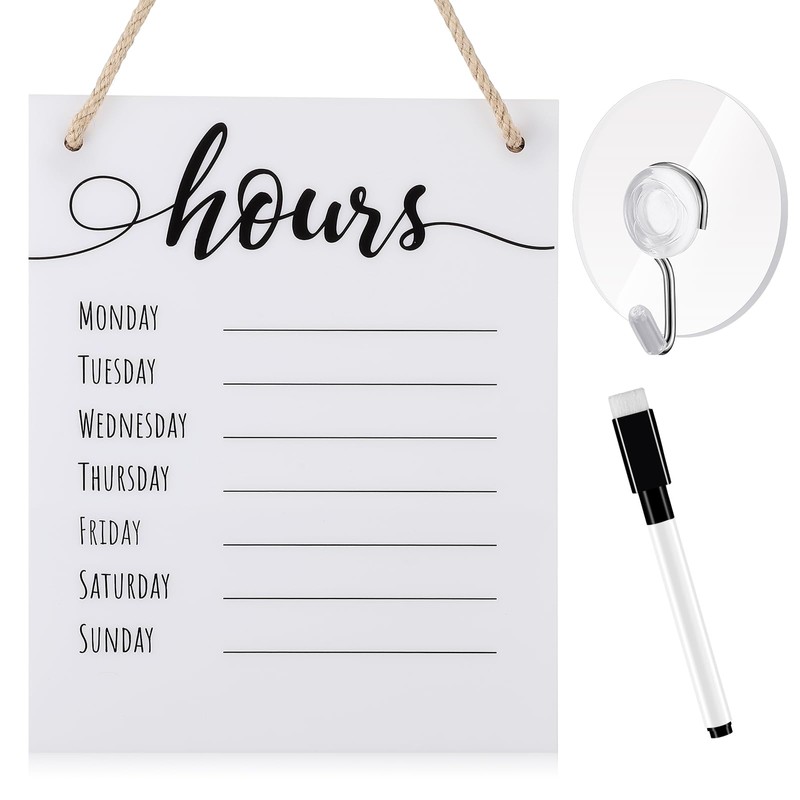 - Complete Set for Versatility: this complete set provides most you need to display your business hours prominently; The business hour sign package includes a sign, an erasable marker, and a suction cup hook, eliminating the menace of purchasing additional items; With our set, communicate your business hours effectively using the store hour sign and the included open close sign