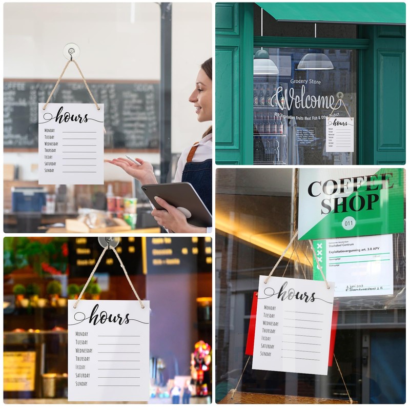 - Quality Material for Durability: work well with a business hour sign made from PETG material; The sign maintains a sleek finish, offering a smooth dry erase surface; Thin yet resilient, this sturdy sign coupled with the tough hemp rope ensures longevity; To ensure successful adhesion, remember to press the suction cup hook firmly when installing the store hours sign