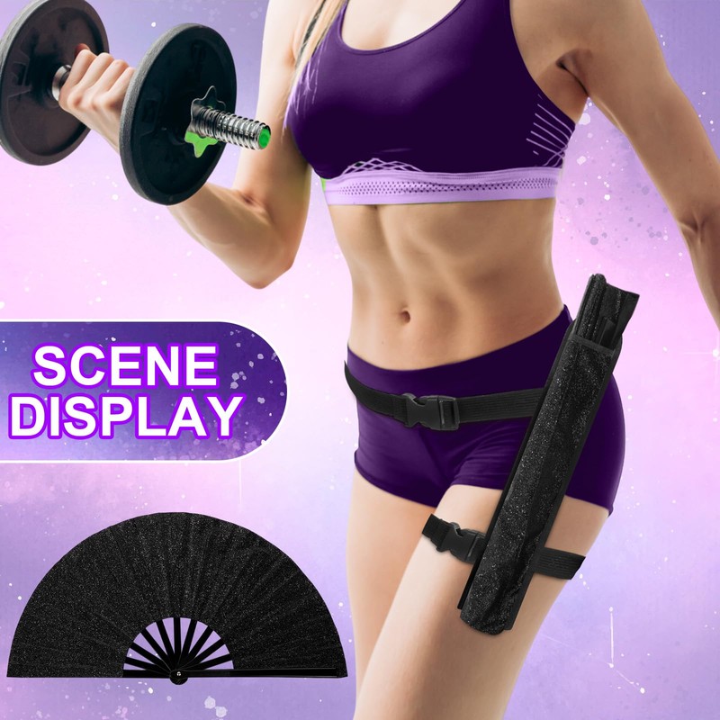 Threehoney 4 Pack Large Rave Fan Folding Shiny Clack Hand Fan with Fabric Case Bag and Leg Strap for Music Festival Dance Club Carnival Disco Party Supplies(Mixed Color)