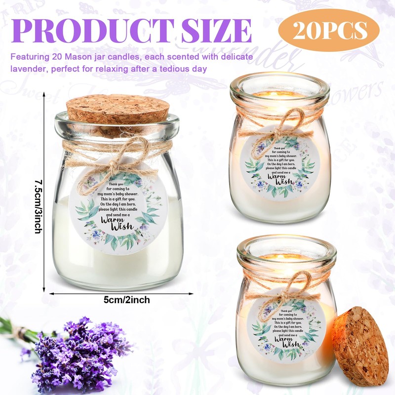 - Enhanced Ambiance Candles: each pack comes with 20 mason jar candles, each intricately scented with a delicate lavender aroma, when lit, these candles create a calming atmosphere, ideal for relaxation after a tedious day, these candles offer a long lasting fragrance, reaching out to many people, promoting a warm and inviting ambiance