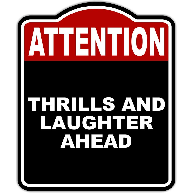 THRILLS AND LAUGHTER AHEAD Attention Red Black Aluminum Composite Sign 8.5 x 10 inches