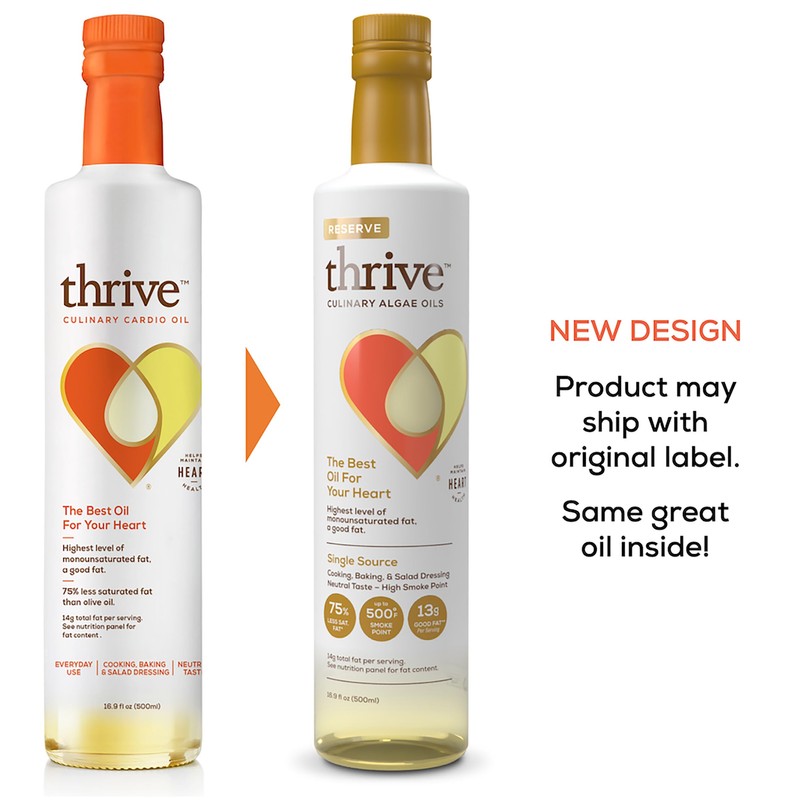 - A better choice to help maintain heart health. You can feel good in the kitchen knowing that Thrive Algae Oil has the highest amount of good monounsaturated fats and the lowest amount of saturated fat compared to other cooking oils.