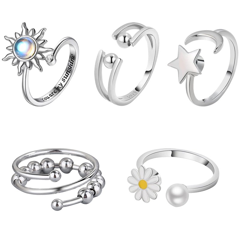 ThrivingAura 5Pcs Anxiety Ring for Women, Fidget ring, Adjustable Open Fidget rings, Twist Rings for Anxious Women Teen Girls, Moon and Stars Adjustable Teens Rings Birthday Party Gifts